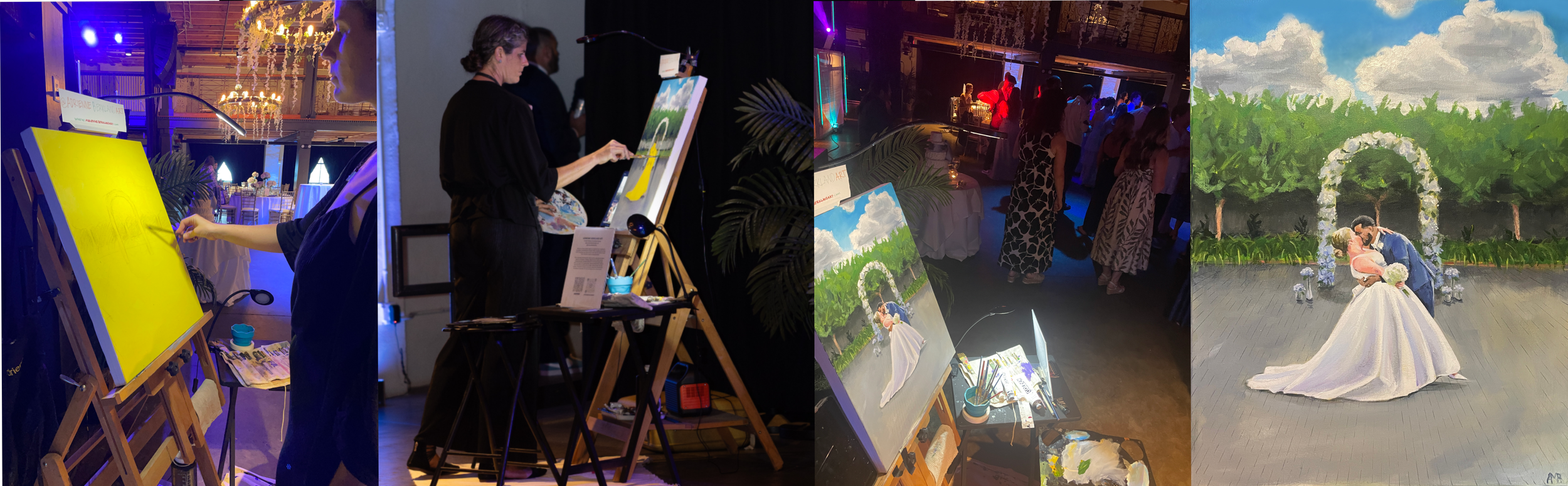 As a live event painter, I complete every painting from sketch to finished painting during your event. Guest get to see your event come to life! My set up requires 5’x5’ of space and that’s it! I bring everything I need to capture your event.